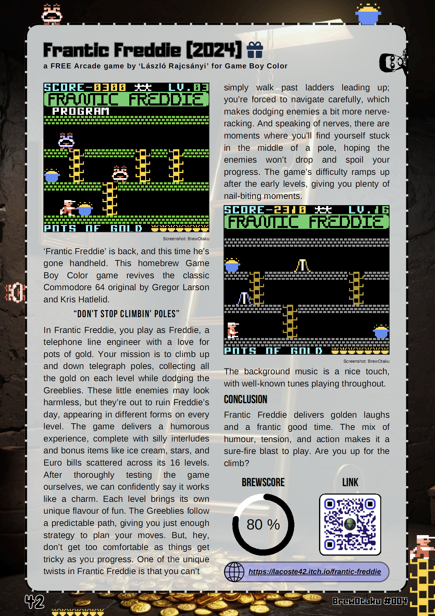 Freddie is a telephone line engineer who has to climb up and down the telegraph poles, picking up pots of gold and avoiding the dreaded Greeblies. The Greeblies take on a different form with every new screen, but one thing’s for sure – they may look cute, but they show no mercy! Frantic Freddie also features wacky messages, funny interludes and silly bonuses. Frantic Freddie – a game with a sence of humour!